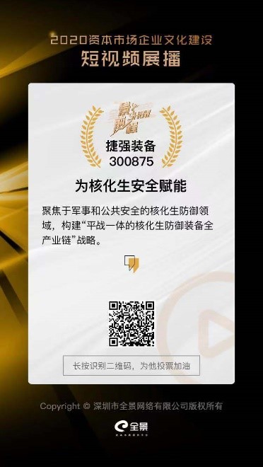 公司宣傳片“捷強裝備:為核化生安全賦能”入選本次“景show前景”展播,為了更好的向社會各界宣傳捷強文化,展示公司在核化生安全領域的責任和擔當,特邀請您為捷強裝備(股票代碼:300875)投票。